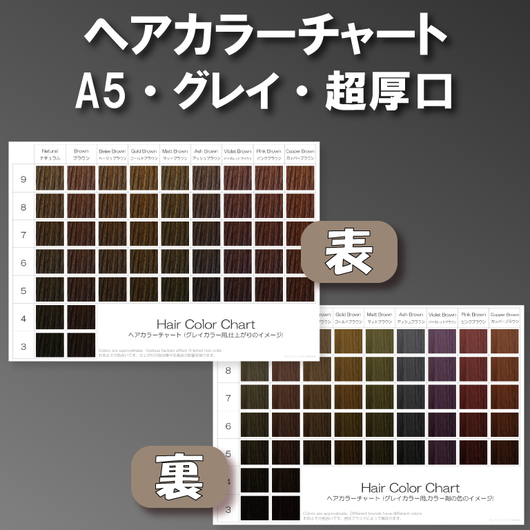 ヘアカラーチャート(グレイカラー,白髪染め) A5超厚口両面 表:仕上がりのイメージ 裏:カラー剤の色のイメージ
