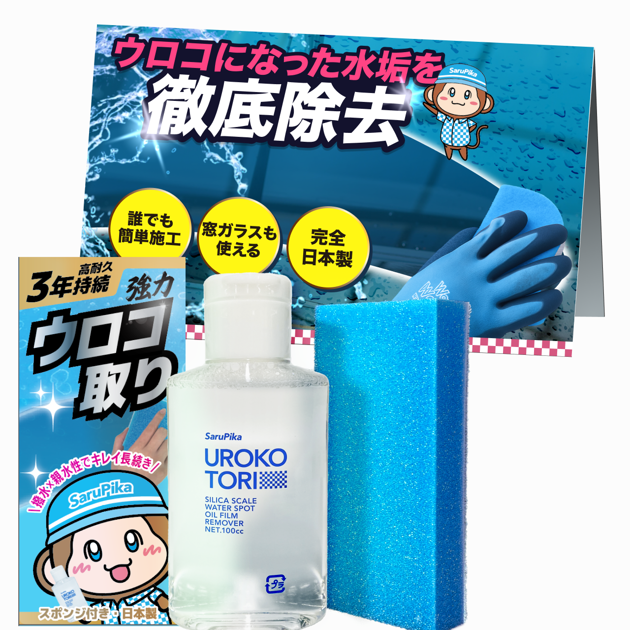 おさる(汚去る)のスゴピカシリーズ 「ウロコ取り」は車窓の水垢ウロコの除去はもちろん、ピラーの水垢、サイドバイザーのくすみやボディ全体の水垢除去にもオススメです。又ご家庭等の浴室の鏡、シンクの水垢も簡単 綺麗に除去出来ます。Youtube動画をご覧ください。https://www.youtube.com/watch?v=iDMhrMCdlWk&t=2s(1)車の窓ガラスのウロコ、水垢が速攻綺麗になります(2)最近流行りのブラックルーフ車の水垢、ウォータースポットも速攻綺麗になります(3)サイドバイザー等のプラスチックの汚れも簡単綺麗になります(4)ピラーパネルの汚れも簡単綺麗になります(5)基本車のボディ全てにご利用頂けます(濃淡色可)注意点 溶液をかけた後、長時間に放置すると塗装が薄利する場合がございます。説明書きを確認の上、適切にご使用下さい。施工手順1.ガラス・ボディの汚れ(砂・ホコリ等)を取り除いてください。2.除去したい箇所の水分を拭き取ってください。(水分が残っていると効果が薄れます)3.市販のスポンジに適量を取り、磨いてください。(ガラス1枚ごとに施工してください)4.汚れの落ち具合を見ながら磨いてください。5.磨き終えたら水でよく洗い流してください。6.汚れが残る箇所は、再度2.3.4.5を繰り返してください。7.きれいなタオル等で拭き上げてください。注意事項...必ずお読みください。1.必ず手袋をしての施工をお願いします。2.炎天下でのご使用は控えてください。3.ガラス面やボディ等が熱くなっている場合は水で冷やしてからご使用ください。4.熱い状態でご使用されますとすぐに乾燥することもあり、シミになる可能性がございます。5.ウロコ取りの溶剤が付いたまま放置はしないでください。6.余った溶剤は冷所での保管をおすすめします。7.目や口等に入った時は速やかに洗浄し、病院での診察を受けてください。8.ご使用後のスポンジは水で溶剤をよく溶剤を洗い流してください。9.フロントガラス・ドアミラーガラスへの施工はおやめください。10.アルミパーツ、メッキパーツは必ずマスキングテープ等で保護してからウロコ取りをご使用ください。万一溶剤が付着した場合はすぐに水洗いしてください。ウロコ取りが付着しますと曇り、くすみ の原因となります。【ご注意】すべての水垢・ウロコ・油膜の除去を保証するものではありません。 長期放置による固着汚れは落ちない場合があります。【返品】商品発送後は、商品に欠陥や損傷がない限り返品できません。