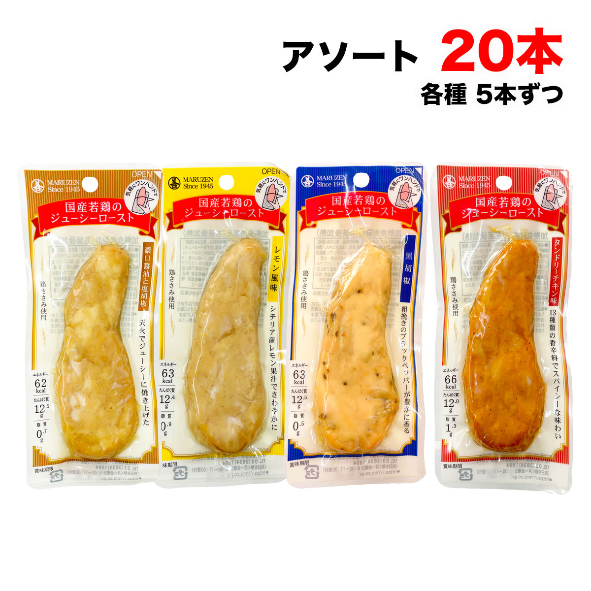 丸善 ささみ 国産若鶏のジューシーロースト アソート 20本 (4種×5本づづ) 濃口醤油と塩胡椒 チキン など 鶏肉 プロテイン 送料無料(北海道・東北・沖縄除く)