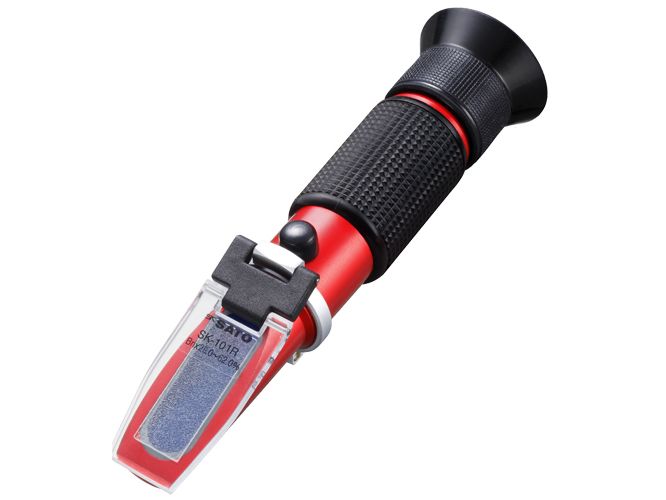 | ご注意 | Brix(%)目盛は、蔗糖溶液100gの中に含まれる蔗糖(g)をパーセントで表したもので蔗糖濃度を意味します。他の物質を主体とした溶液で、特に定量的に濃度を知りたいときは換算表が必要です。 製品は全反射の原理にもとづいた屈折率を利用し、液体濃度を測定する機器です。そのため、光を通さない液体(牛乳など)にはご使用できません。 |