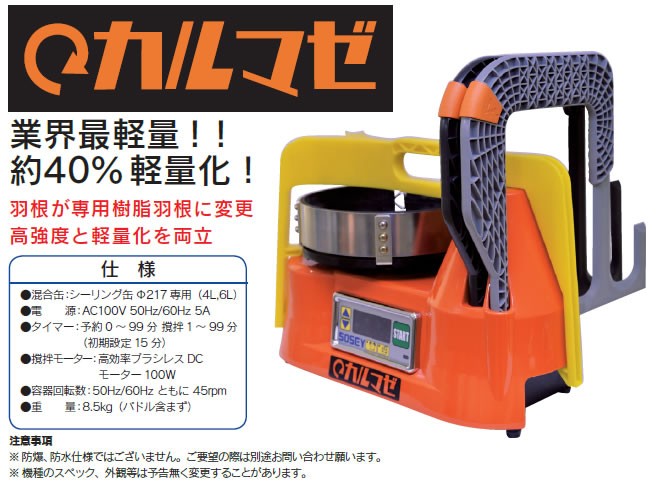 仕様●混合缶:シーリング缶Φ217 専用(4L,6L)●電源:AC100V 50Hz/60Hz 5A●タイマー:予約0〜99分 撹拌1〜99分( 初期設定15分)●撹拌モーター:高効率ブラシレスDC モーター100W●容器回転数:50Hz/60Hz ともに 45rpm●重量:8.5kg(パドル含まず)
