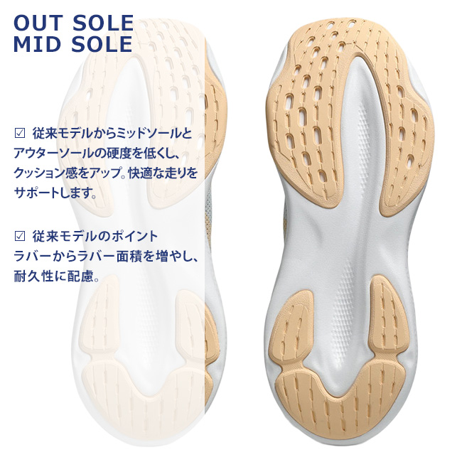 アウターソールはラバーの面積を大きくすることで耐久性に配慮。