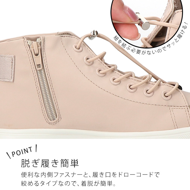 便利な内側ファスナーと、履き口をドローコードで絞めるタイプなので、着脱が簡単。