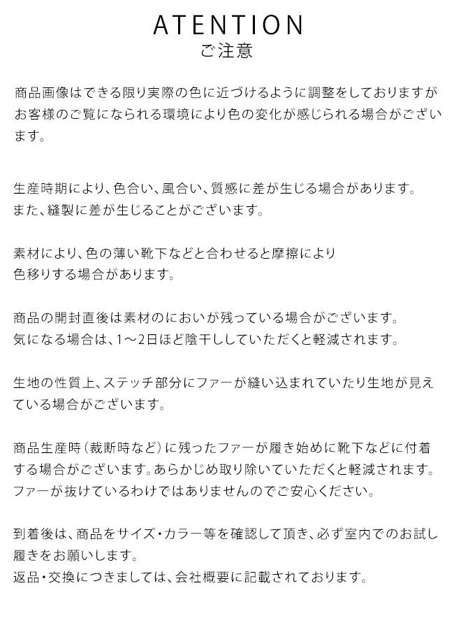 ※商品生産時(裁断時など)に残ったファーが履き始めに靴下などに付着する場合がございます。