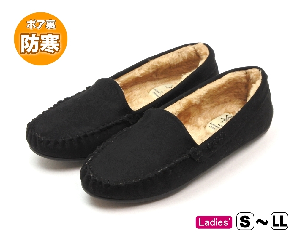 レディース あったか モカシンシューズ スエード調 フラットシューズ ブラック