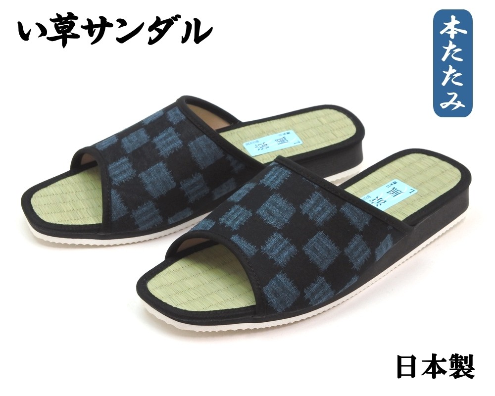 男性用 い草サンダル 軽量 前あき ヘップサンダル 日本製 市松柄 ネイビー