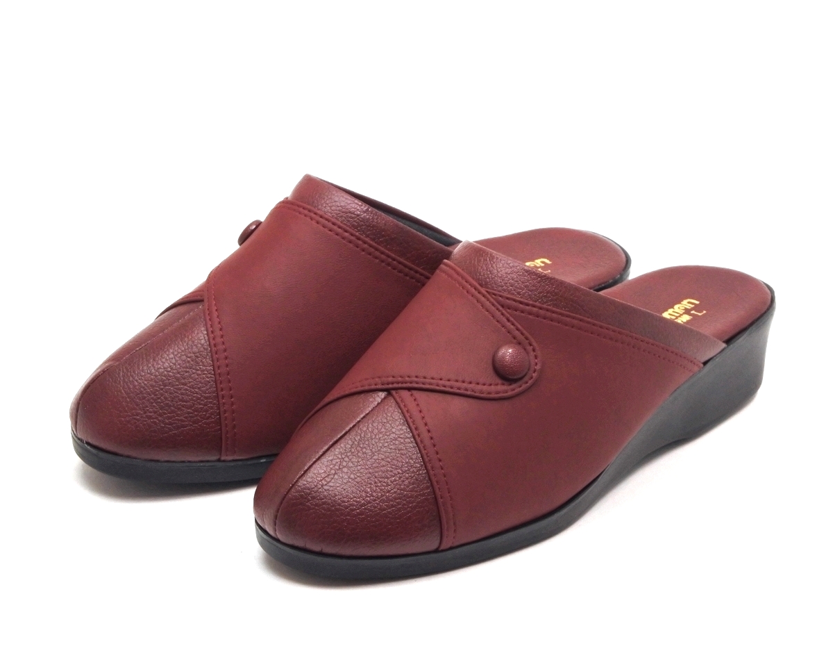 レディース 防寒ヘップサンダル 飾りボタン 前かぶり つっかけ シンプル 日本製 エンジ