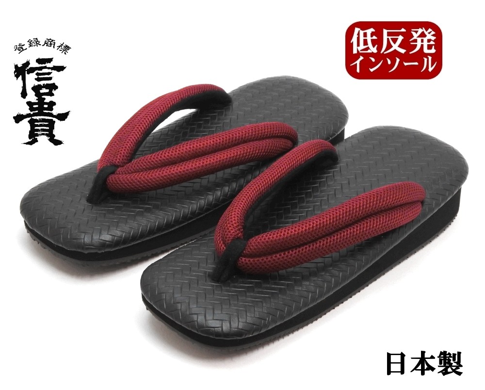 信貴 男性用 雪駄 草履 レザー調 型押し メッシュ鼻緒 黒アメ底 低反発 日本製 レッド