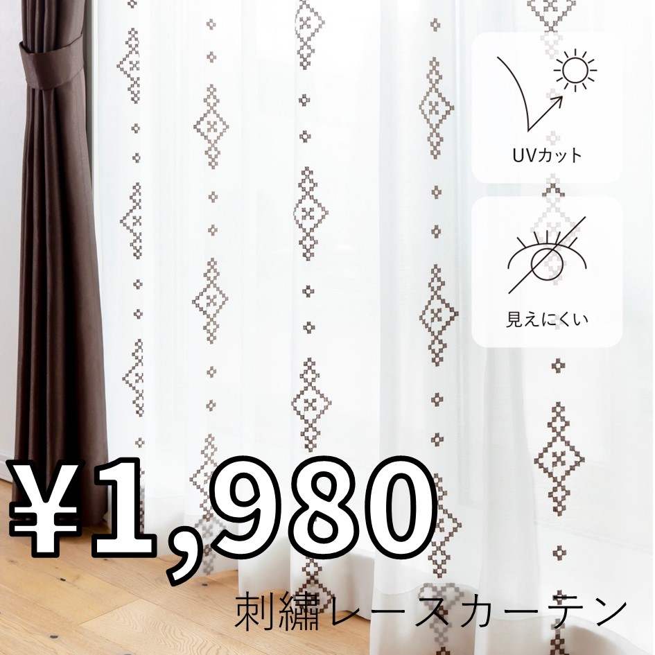 スクエアラインブラウン レースカーテン 刺繍 モダン 北欧 おしゃれ 既製品 2枚組 幅100 洗える ブラウン 茶色 シンプル