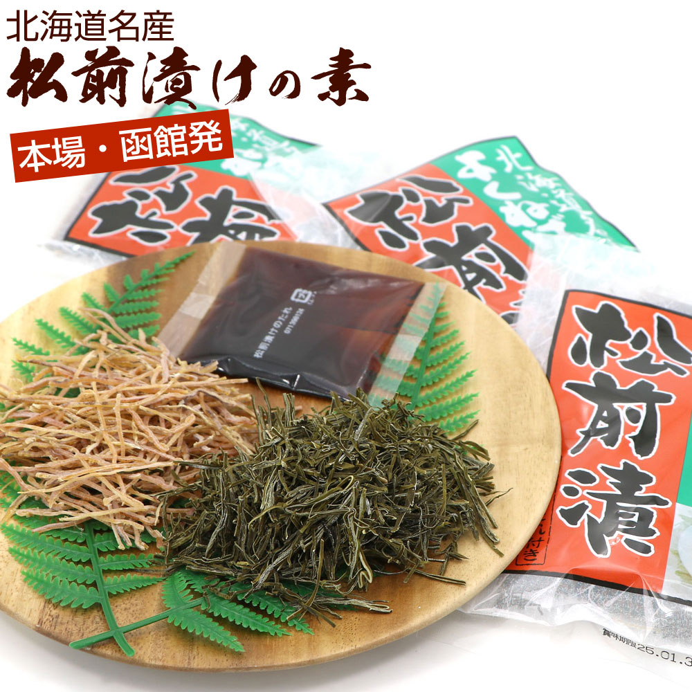 国産の「細切りするめ」、旨味豊富な「真昆布」、ネバネバ昆布の「がごめ昆布」を使用した本場「北海道 函館」ならではの松前漬けの素です。