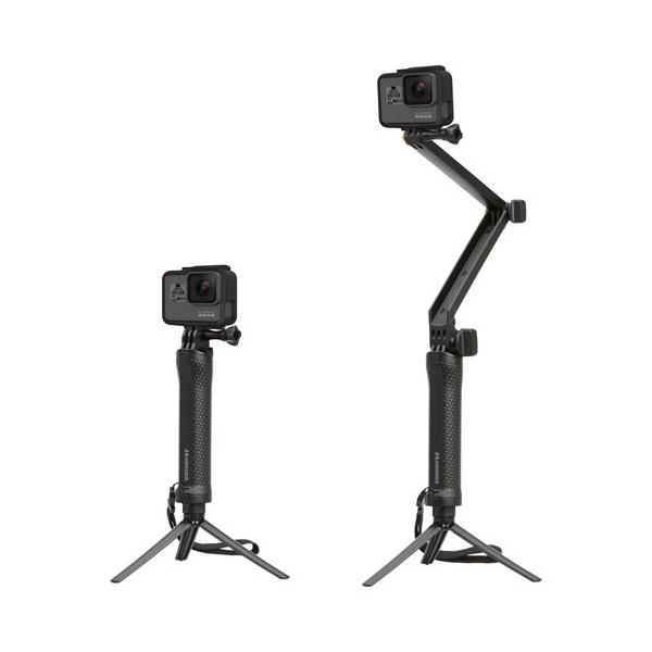 安定した撮影が可能なグリップスタイル アームを外したグリップスタイルでは安定した手持ち撮影ができます。グリップは滑り止め塗装とエンボス加工を施した握りやすい仕様です。 | アームを伸ばして広角に撮影 長さと角度が自由に調整でき、アームを伸ばせば腕の延長として距離を取った位置から広角に撮影することができます。手首に掛けて使用するハンドストラップも付属しています。 |
