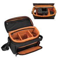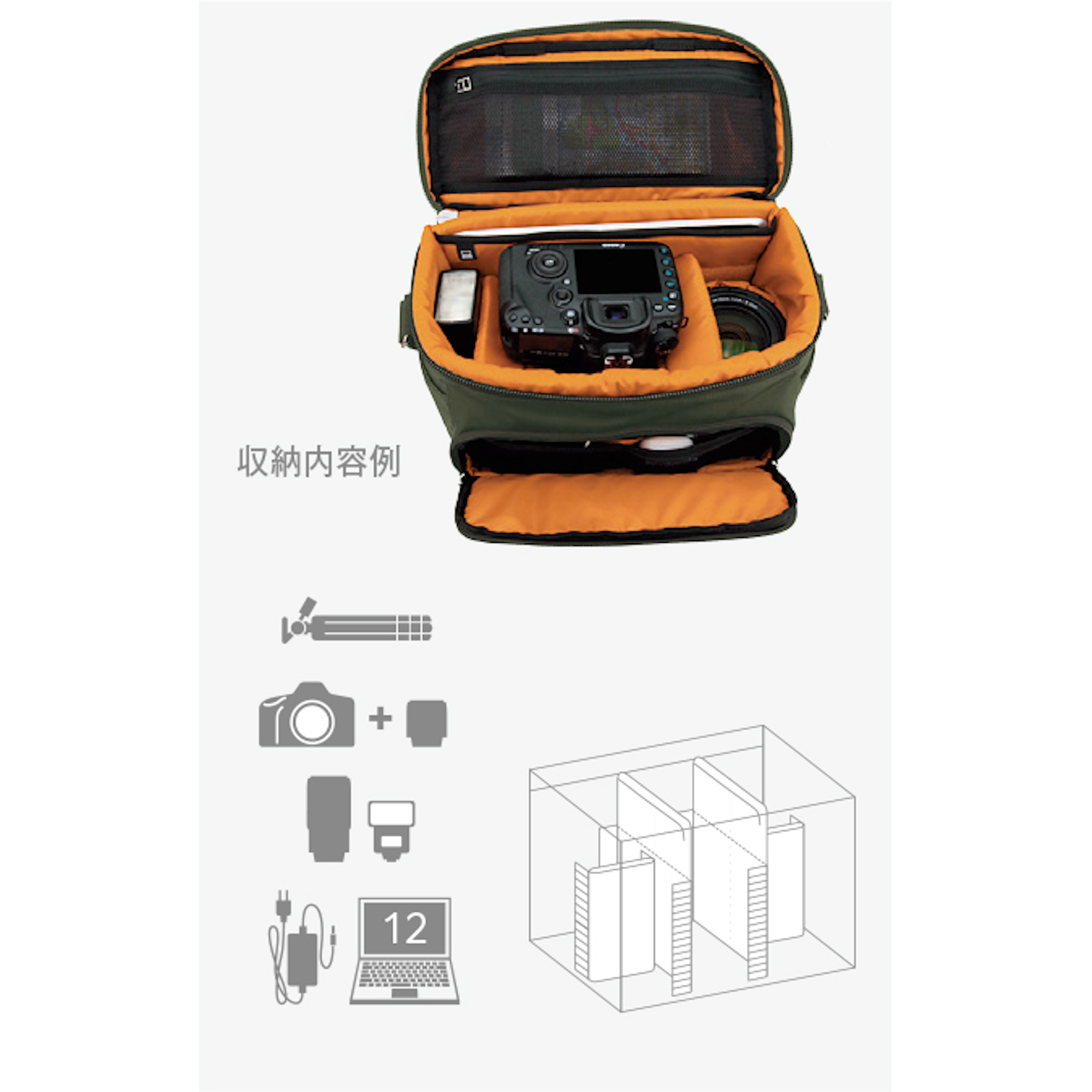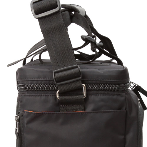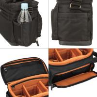 全体に水に強い生地を採用![]() 表生地には軽量で上品な光沢感が特徴の高密度ナイロンツイルに、水に強い裏面PVC加工を施した生地を採用しています。(写真はブラック) | 機材の見やすい大容量機材収納部![]() 大口径標準ズームレンズを装着したハイエンド一眼レフカメラ1台、大口径広角ズームレンズ1本、ストロボなどのアクセサリー類、12インチ相当のノートPCの収納が可能です。内生地は機材の見やすいオレンジを採用しています。 |