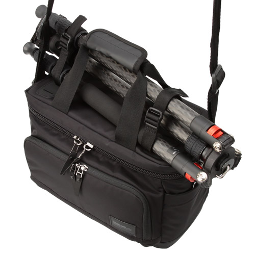 三脚を固定して持ち運びが可能![]() 天面のベルトを使って小型の三脚やウェア等を固定することができます。三脚とショルダーベルトが干渉しにくいよう、左右のベルトの位置を前後にずらして取り付けることが可能です。(写真はブラック) | 持ち運びや汚れに配慮した仕様![]() 背面にはキャリーバッグに通して固定できるキャリーバーホルダーが付いているので、旅行や出張に便利です。底面には防水性と防汚性に優れたターポリン素材を採用。汚れを軽減するフットスタンドが付いており、安心して地面に置くことができます。 |