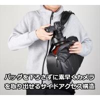 バッグを下ろさずに素早くカメラを取り出せるサイドアクセス構造![]() 地面にバッグを下ろさず前に回してカメラを取り出せる、サイドアクセス構造。素早くカメラを取り出せるので、シャッターチャンスを逃がしません。 | ズームレンズを装着した一眼カメラと交換レンズ1本を収納可能![]() コンパクトなフォルムながら、標準ズームレンズを装着した一眼レフカメラと、交換レンズをしっかり収納可能。本格的な撮影にも対応しています。ファスナーは信頼のYKK製を採用。 |