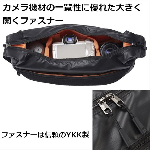 水や汚れに強く、しなやかな特殊コーティング生地を採用した約300gの超軽量カメラショルダーバッグ![]() 水や汚れに強く、しなやかで軽量なポリカーボネートコーティング素材を採用した、重量約300gの超軽量カメラショルダーバッグです。カメラ機材収納部へは上部のファスナーから素早くアクセス。フラットに折りたたむことができるので、トラベルカメラバッグとしてもお使いいただけます。 | 水や汚れに強いポリカーボネートコーティングを施した軽量素材![]() 軽量で引き裂きに強いリップストップ生地を採用。特殊なポリカーボネートコーティングを施した生地表面は、水濡れに強く表面の汚れも簡単に拭き取ることができます。 |
