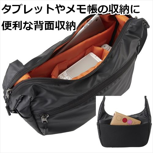 カメラ機材の一覧性に優れた大きく開くファスナー![]() 大きくファスナーが開き、素早くカメラを取り出すことができシャッターチャンスを逃がしません。標準ズームレンズを装着した小型一眼レフカメラと、交換レンズや小物類をしっかり収納可能。ファスナーは信頼のYKK製を採用。 | タブレットやメモ帳の収納に便利な背面収納![]() メイン収納部の背面側にはタブレットなどの収納に便利なPCポケットを備えており、背面外側のオープンポケットはメモ帳などの収納に便利です。背面にはエアメッシュ素材を採用することで蒸れを抑え快適に使用可能です。 |