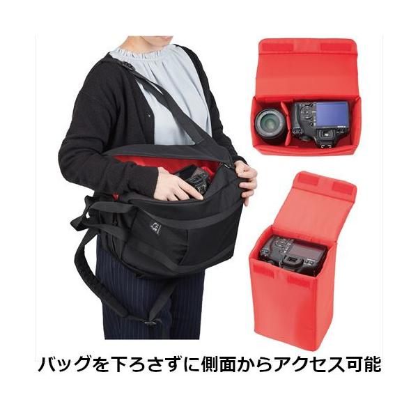 側面が大きく開くためバッグを下ろさずに側面から収納物の出し入れが可能です。インナーケースはバッグ内で使いやすいように、タテにしても使用可能です。標準レンズ付き小型一眼レフカメラ、もしくはミラーレスカメラと、交換レンズ1本の収納が可能です。インナーケースタイプなので外して使用したり、別のインナーケースに替えることも可能です。