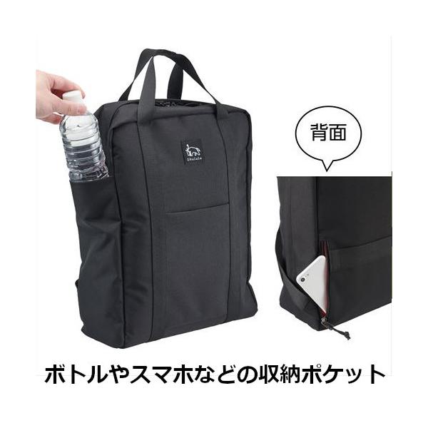 側面にはボトルや折り畳み傘をすっぽり収納できるポケット、背面にはスマホや定期などすぐ取り出したいものを収納できるポケットがあります。