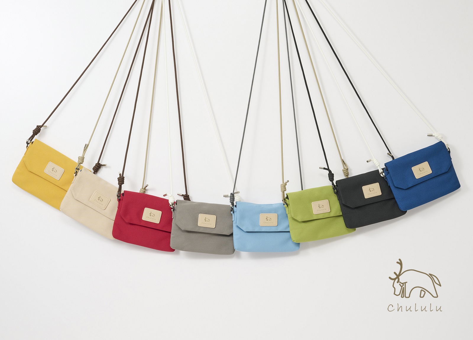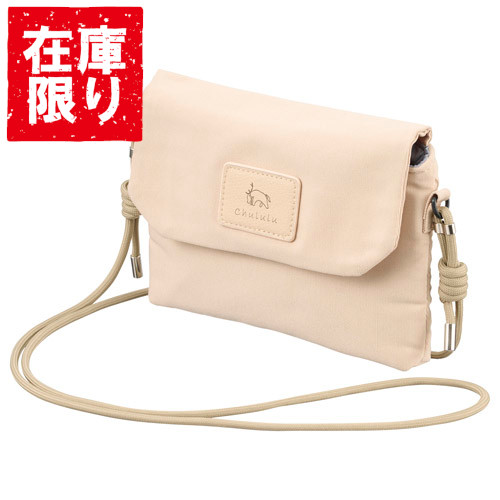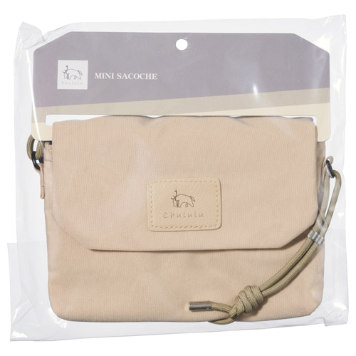 小物の仕分けがしやすいよう、内側に大小ふたつのポケットと、背面にジッパー付きのポケットが付いています。フラップ前面にはワンポイントとして革調素材の「Chululu」ロゴを組み合わせています。