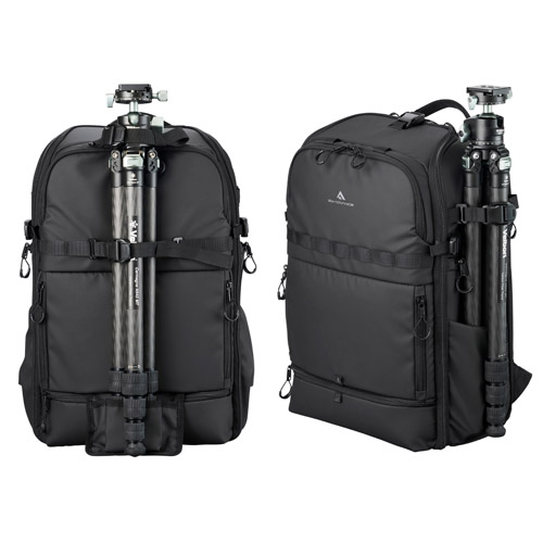 着脱式の固定ベルトをフロントや両サイドのデイジーチェーンに付け替えることで、三脚をセンターまたはサイドに取り付け可能です。センターに取り付ける場合は脚を引き出し式のレッグポケットに入れ、固定ベルト2本で固定します。サイドに取り付ける場合は脚をサイドポケットに入れ、固定ベルト1本で固定します。
