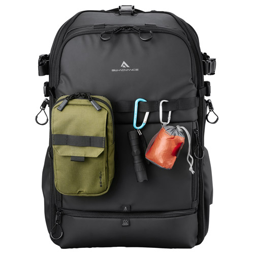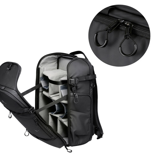 フロントパネルには小物や撮影アクセサリーなどをたっぷり収納できるマチ付きの3段式ファスナーポケットを装備。上段はインナーポケットとフックコードが付いた整理しやすい小物ポケット、中段に三脚を取り付けたままでもアクセス可能な左右で独立したサイドポケット、下段にはレインカバー収納用のポケットを備えています。バッグ両側面には、ドリンクボトルなどが収納でき、使用しない時はフラットになるスリムデザインのサイドポケットを装備しています。