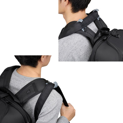 日本人の体形にフィットするエルゴノミクスカーブのショルダーハーネスは、高いクッション性で肩にかかる圧力を分散させ、疲労を軽減します。バックパックのフィット感と安定性を向上させるチェストベルトは、体型に合わせて取り付け位置の高さを4段階に調節可能。使用しない場合はショルダーハーネスから取り外せます。