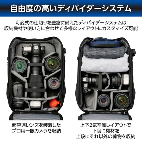 収納部のディバイダーシステムは収納機材や使い方に合わせて多様なレイアウトにカスタマイズが可能。配置を変えることで150-600mm F5-6.3のような超望遠レンズを装着した一眼カメラの収納にも対応します。また、上下2気室風のレイアウトで、下部にはにカメラ機材を、上部にはにウェアなどの機材以外のアイテムを分けて収納することも可能です。