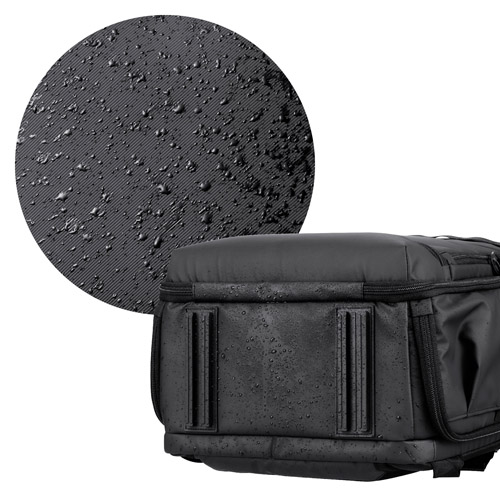 メイン生地には汚れや水に強いPUコーティングポリエステル素材を採用しています。底面にはさらに防水性に優れたターポリン素材を使用し、バッグの自立をサポートして直接地面に接することを防ぐフットスタンドを備えています。ぬかるんだ場所でも安心してバッグを置いて撮影に集中でき、付着した汚れも簡単に拭き取ることができます。