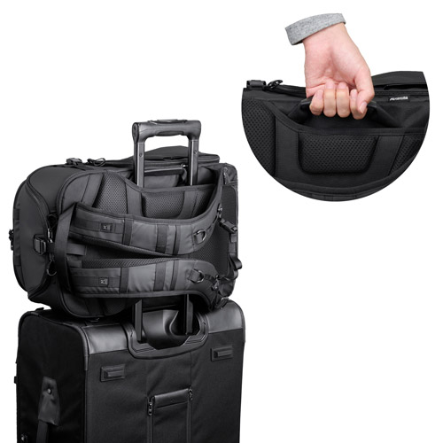背面にはキャリーバッグのハンドルを通せるスリーブが付いています。旅行や出張撮影など、多くの荷物を運搬する際に役立ちます。さらに、キャリーハンドルからの抜き差しや積み下ろしの際に役立つサイドハンドルも装備。使用しない時はスリーブ内に格納できるので邪魔になりません。
