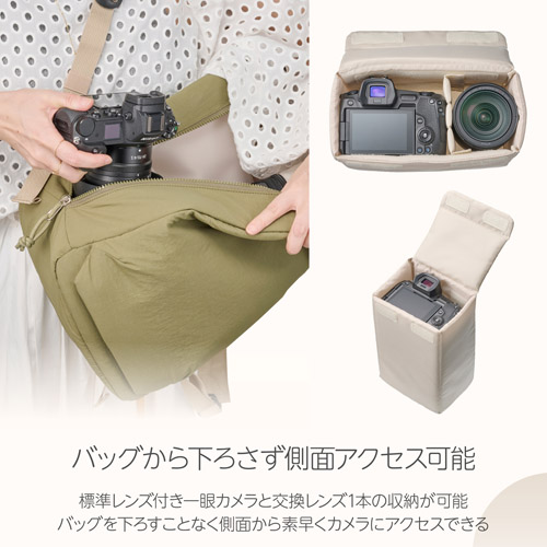 標準レンズ付き一眼カメラと、交換レンズ1本の収納が可能。バッグを下ろすことなく側面から素早くカメラにアクセスできます。