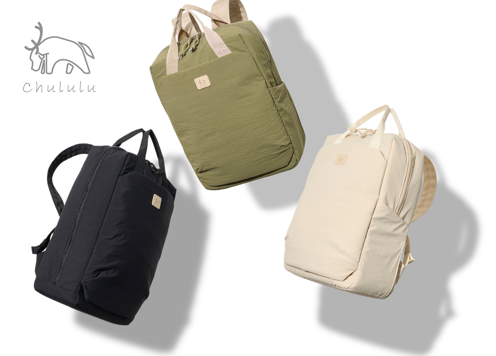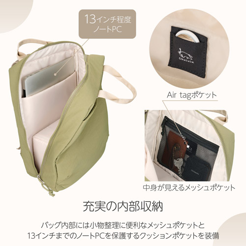 バッグ内部には小物整理に便利なメッシュポケットと、13インチまでのノートPCを保護するクッションポケットを設けています。メッシュポケット内側の「Chululu」タグは、AirTagなどの紛失防止タグを入れられる隠しポケットになっています。※AirTagは、Apple Inc.の登録商標です。