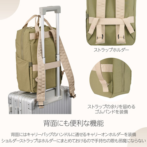 背面にはキャリーバッグのハンドルに通せるキャリーオンホルダーを装備。手持ちの際は、ショルダーストラップをホルダーにまとめておけるので、垂れ下がって邪魔になることがありません。さらに、ストラップの余りを留めるゴムバンドも付いているので、どのようなスタイルでもすっきりと持ち運べます