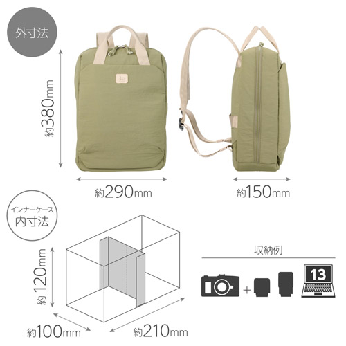 カメラ収納部は、縦方向、横方向のどちらにも開くインナーケース式です。収納する機材やバッグ内の他の荷物に合わせて自在に配置を変更できます。インナーケースを取り外せば、通常のバックパックとしても使用可能です。