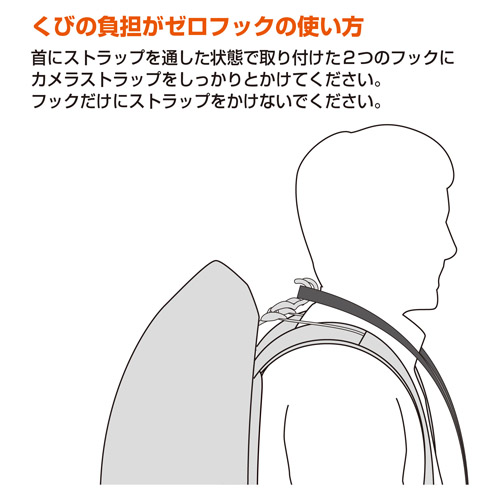 「くびの負担がZEROフック」は、バックパックに取り付けたフック状のパーツにカメラストラップを引っ掛けることで、首に掛かるカメラの重みをゼロにする画期的な製品です。圧倒的な世界シェアを誇るファスナーメーカーYKKとカメラ用品のハクバ写真産業が共同開発することにより生まれました。