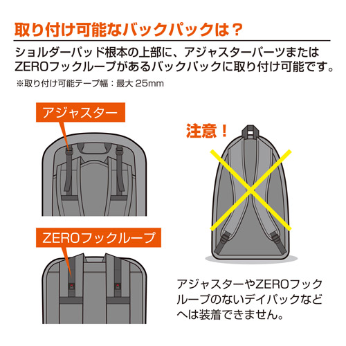 ショルダーパッド根本の上部に、アジャスターパーツがあるバックパック、または「ZEROフックループ」があるバックパックに取り付け可能です。取り付け部分のないバックパックには装着できません。