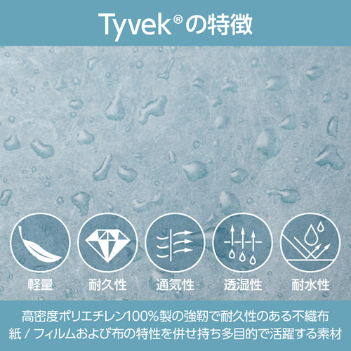 Tyvek(R)は高密度ポリエチレン100%製の強靭で耐久性のある不織布で、紙、フィルムおよび布の特性を併せ持ち多目的で活躍する素材です。