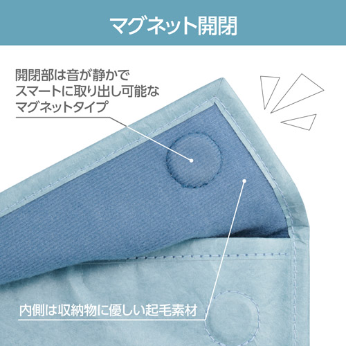 開閉部には、面ファスナーに比べ音が静かでスマートに中身を取り出せるマグネットタイプを採用。内側は収納物に優しい起毛素材です。