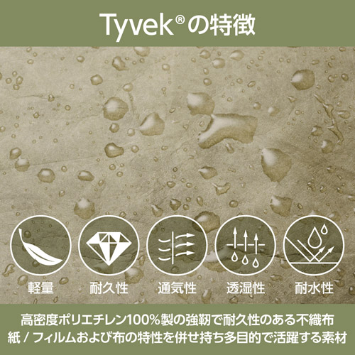 Tyvek(R)は高密度ポリエチレン100%製の強靭で耐久性のある不織布で、紙、フィルムおよび布の特性を併せ持ち多目的で活躍する素材です。