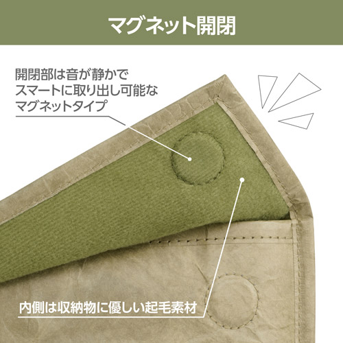 開閉部には、面ファスナーに比べ音が静かでスマートに中身を取り出せるマグネットタイプを採用。内側は収納物に優しい起毛素材です。