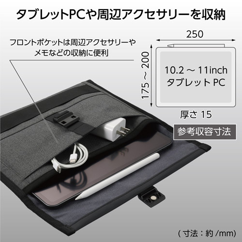 10.2インチのタブレットPCから、ペンシルやキーボードを装着した11インチのタブレットPCまで収納可能です。フロントポケットはケーブル等の周辺アクセサリーやメモなどの収納に便利です。