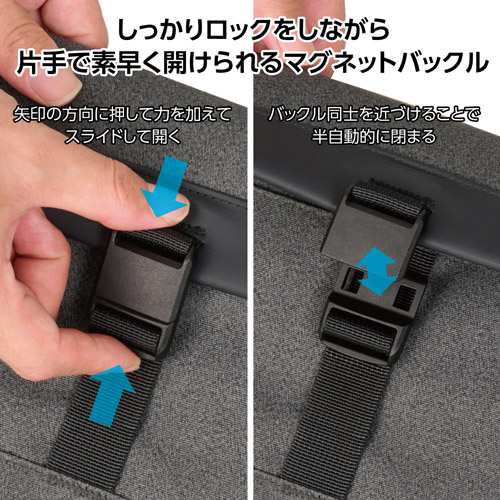 しっかりロックをしながら、片手で素早く開けられるマグネットバックルです。マグネットは矢印の方向に押して力を加えることでスライドして開きます。閉める時はバックル同士を近づけることで半自動的に閉まります。