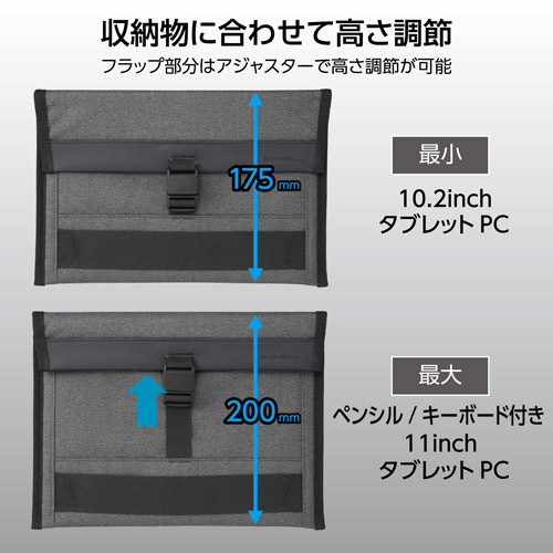 フラップ部分はアジャスターで高さ調節ができ、最大200mmの収納物まで収納が可能になります。(10.2インチのタブレットPC〜ペンシルやキーボードを装着した11インチタブレットPCまで)