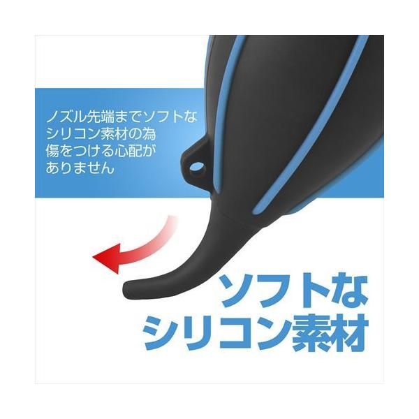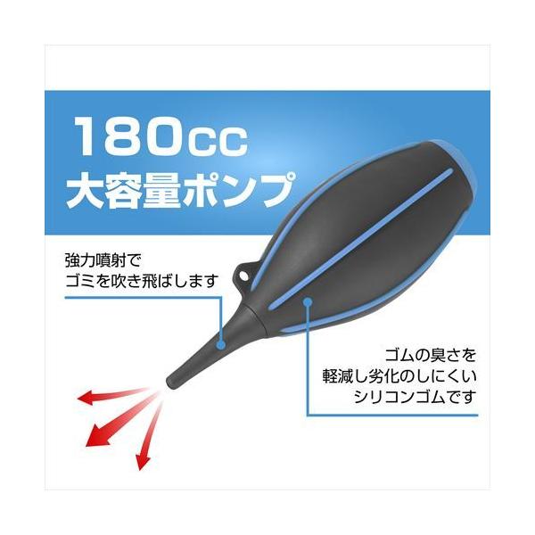 100cc大容量ポンプによる強力噴射でゴミを吹き飛ばすシリコン製プロフェッショナルブロアー レンズやカメラのクリーニングに最適なシリコン製プロフェッショナルブロアーです。180ccのポンプ容量による強力噴射でゴミを吹き飛ばします。握りやすいグリップデザインと立てて置きやすいスタンド形状が特徴。ゴム臭さを大幅軽減し、劣化のしにくいシリコンゴム製です。 | 握りやすいグリップデザイン ブロアー本体に立体的なライン形状を施しており、ポンピング時に滑りにくくしっかりと握ることができます。 |