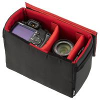 | 普段使いのバッグをカメラバッグに! そのまま入れるだけでいつものバッグがカメラバッグに早変わり。全面の厚いクッションが機材をしっかり保護します。 | 機材に合わせて調整可能な仕切り 収納する機材に合わせて面ファスナーで移動が可能な仕切りが2枚付属しています。 |