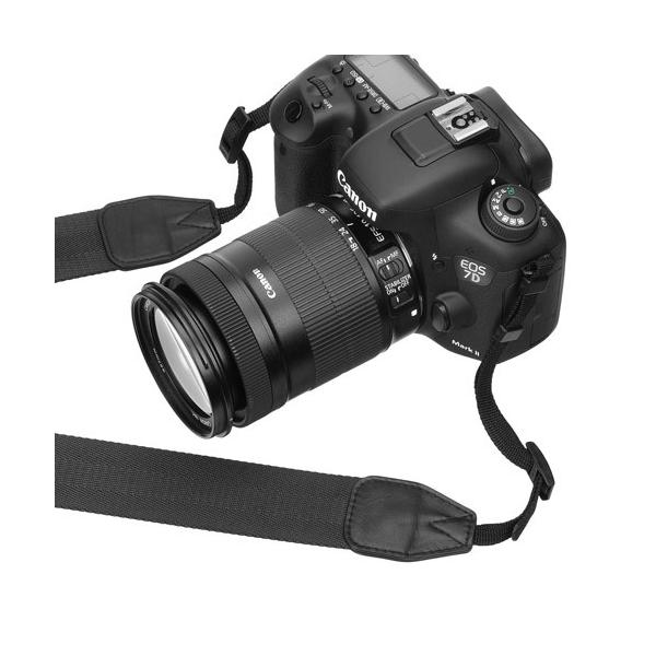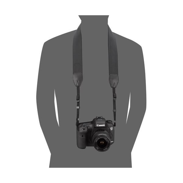 | 一眼レフに対応した10mm幅の先ヒモ 一眼レフカメラや大きめミラーレスカメラに対応する10mm幅の先ヒモを採用しています。 | 装着イメージ 38mm幅の装着イメージです。上下に約8cmの長さ調整が可能です。 |