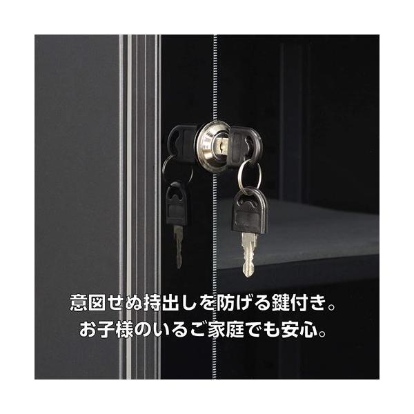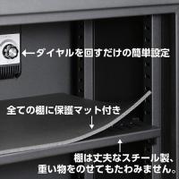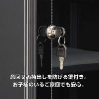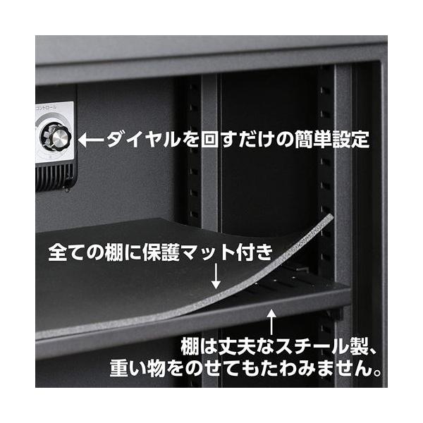 | カギ付きで安心 鍵でロックできるので不意に扉が開くのを防げます。またお子様のいる家庭では、収納物の落下によるケガ防止にも。 | 省電力・静音タイプの除湿ユニット ダイヤルを回すだけで湿度を一定に制御。除湿ユニットはファンやモーターなど音の出る部品を使用しないのでほぼ無音。ひと月の電気代はわずか30円前後で経済的。交換不要の特殊乾燥剤を採用したメンテナンスフリータイプ。 |