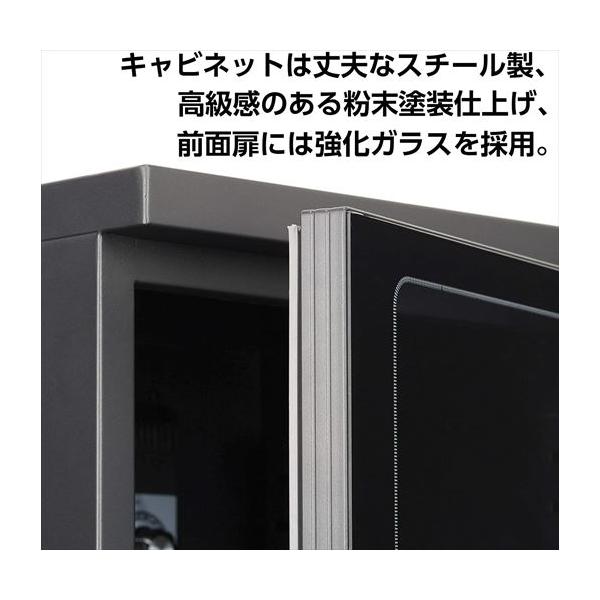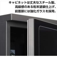 | 丈夫なスチール製の棚板とカメラを保護する付属マット 棚は重いレンズやカメラを載せてもたわむことがない丈夫なスチール製。機材に合わせて25mm間隔で棚の上下移動が可能。全ての棚に傷防止用のマット付き。機材のキズ付きを防ぎます。 | スチールキャビネットと強化ガラス扉 キャビネットはスチール製で高級感のある塗装が施されており、前面扉には全面強化ガラスを採用。 |