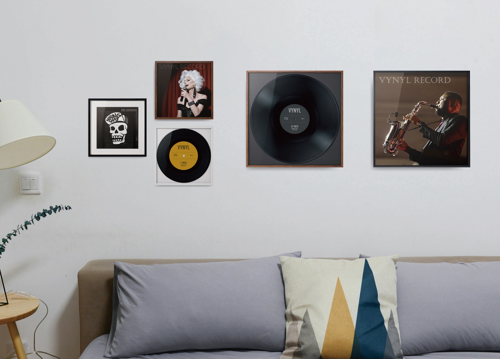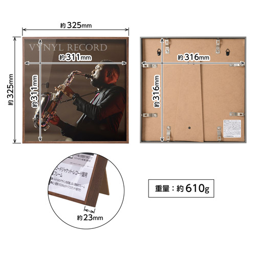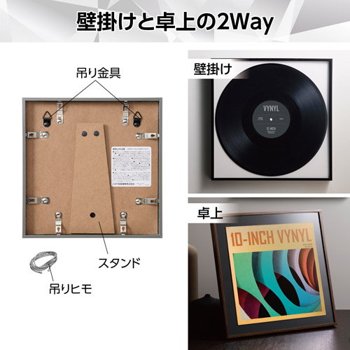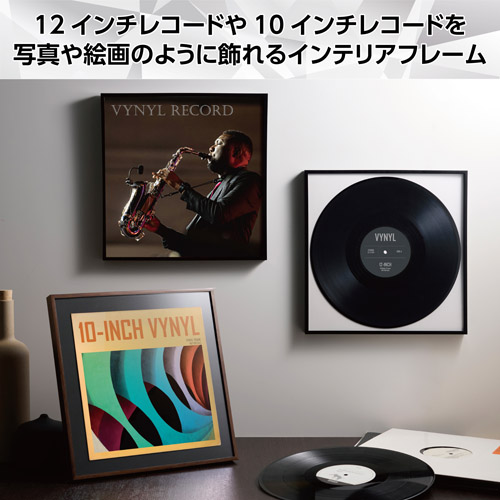 12インチのLPレコードジャケット(310〜315mm角)がピッタリと収まり、写真や絵画のようにお部屋に飾れる薄枠でシンプルなインテリアフレームです。