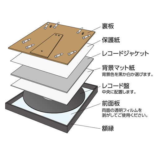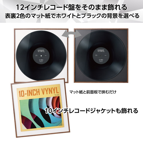 付属の背景マット紙を使用して、レコード盤をそのまま飾ったり、10インチレコードジャケットを飾ることも可能。