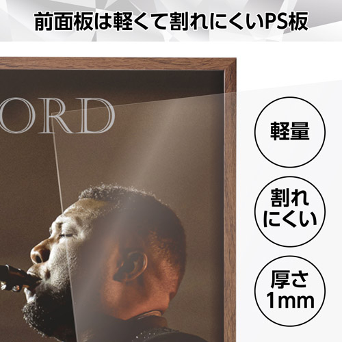 ジャケットやレコード盤をキズやホコリから守る前面板には、軽量で割れにくい厚さ1mmのPS板を使用しています。 軽いため壁へ掛ける際の負担が少なく、ガラスと違って万が一落下したときでも安心です。